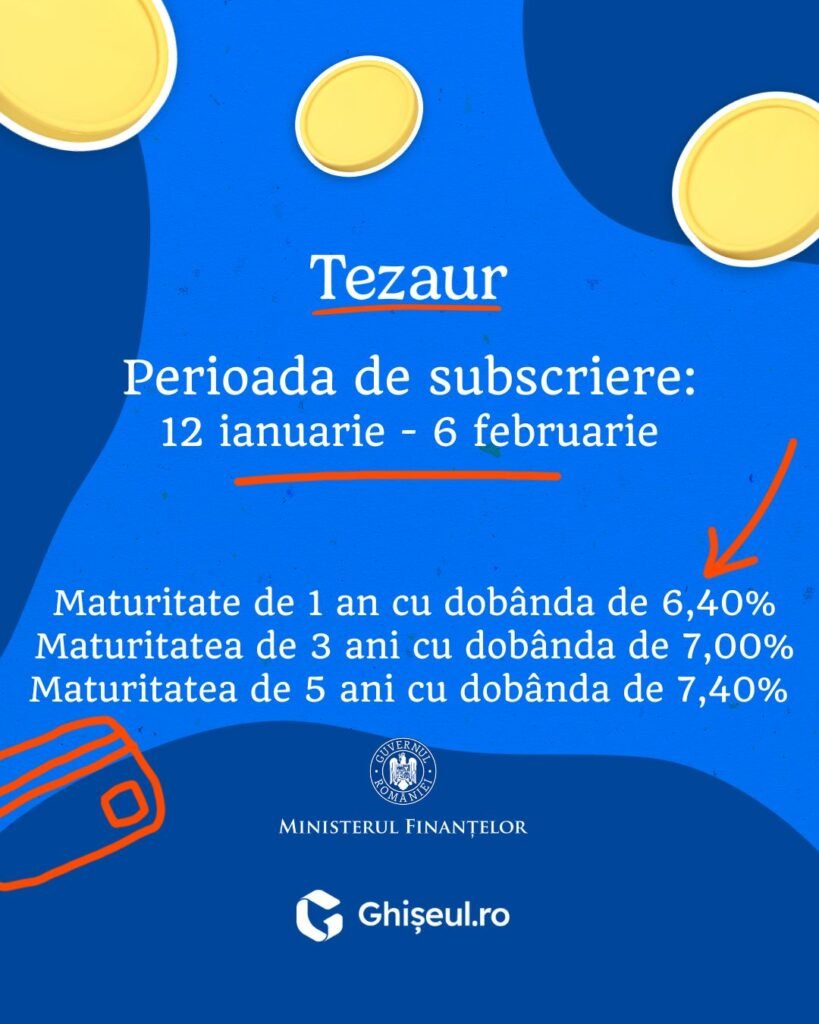 În perioada 12 ianuarie 2026 – 6 februarie 2026, românii pot investi în titlurile de stat TEZAUR, cu maturități de 1, 3 și 5 ani și dobânzi anuale de 6,40%, 7%, respectiv, 7,40%.